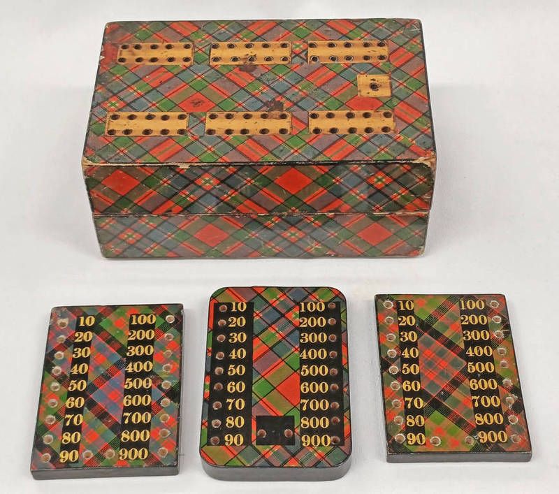 19th century tartan ware cribbage box and contents, box marked mcfarlane 12.5cm wide, counters are 6.5cm and 7.5cm long -4-