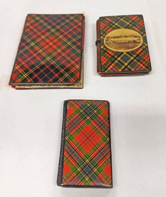 Three examples of 19th century tartan ware, aberdeen from balnagask needle book 7.7cm long, mclean swatch book 7.5cm long, and a albert note book 10cm long -3-