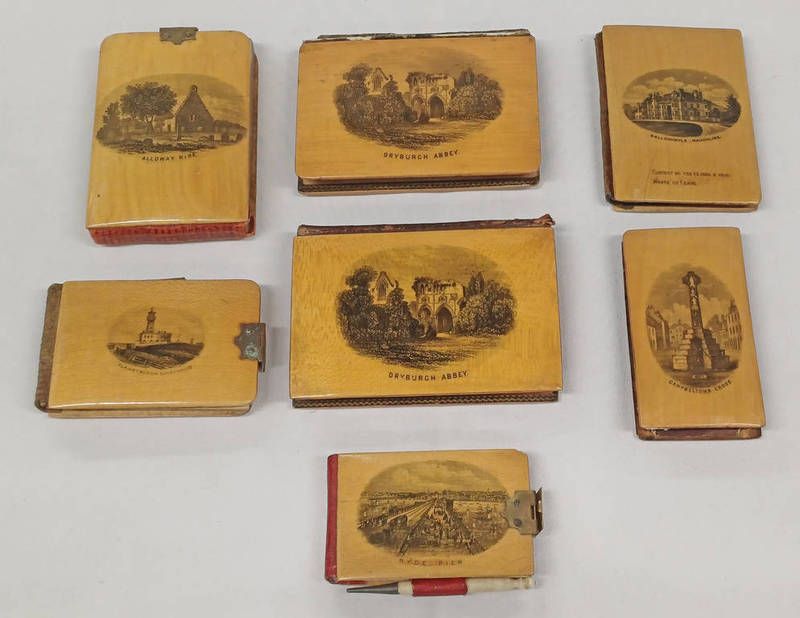 Seven examples of 19th century mauchline ware, alloway kids note book 8.5cm long, dryburgh abbey song book 9cm long, dryburgh abbey book - the lay of the last minstrel 9cm long, ballochmyle mauchline needle book, 7.7cm long, etc -7-
