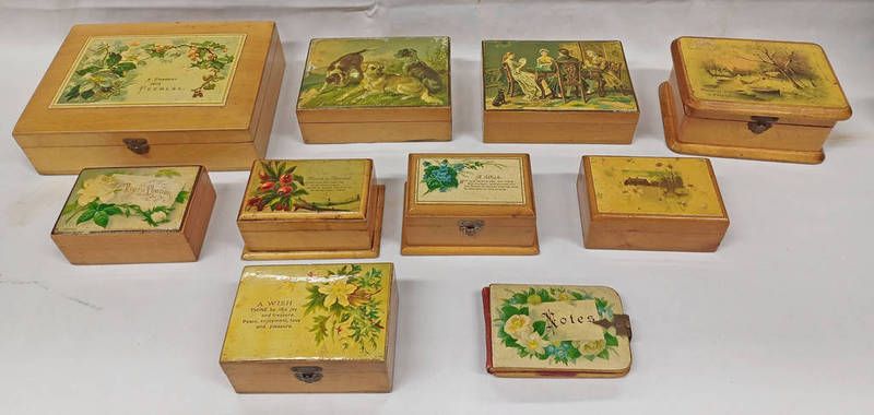 Ten examples of 19th century mauchline ware, a present from peebles box 16.5cm across, note book 8.5cm across, box with 3 dogs to top 11.6cm across, etc -10-