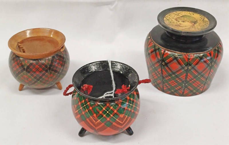 Three examples of 19th century tartan ware, two 3 legged pot bellied cauldrons with rope handles 5.8cm tall, and a prince charlie lidded pot with clark & co label to interior of lid -3-