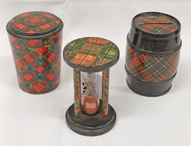 Three examples of 19th century tartan ware, mcbeth barrel money bank 8cm tall, hour glass 8.3cm tall, and a macduff whisky dram glass and case 8cm tall -3-