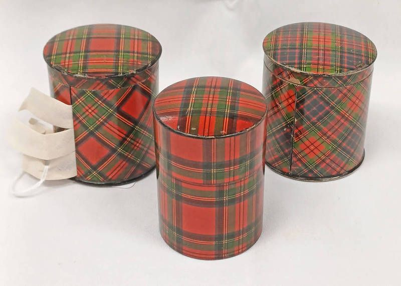 Three 19th century tartan ware rolled tape casket/dispensers, stuart example with medlock rolled type casket label to base 7cm tall, stuart example with kerr and clarks enamelled thread label to interior 7.5cm tall and an albert example with label to base and interior 6.8cm tall -3-