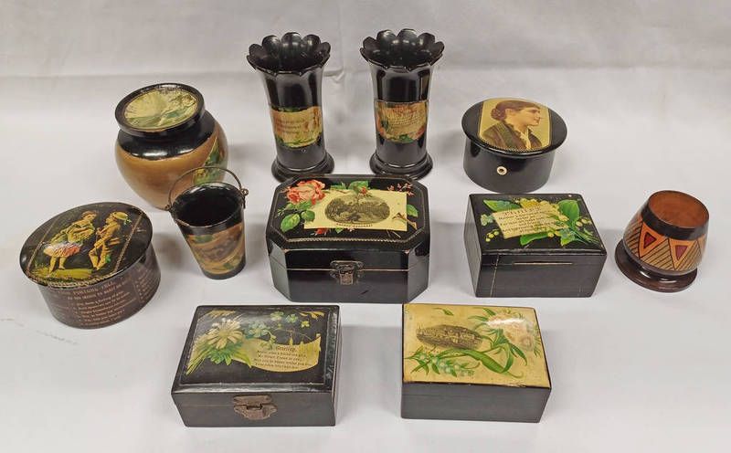 10 examples of 19th century mauchline ware, burns monument box 10.5cm across, pair of vases 11cm tall, sewing thread box 8.5cm across, cowes isle of wight box 8cm across, and 5 other similar examples and one other -11-