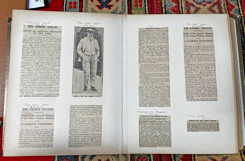 Early 20th century scrap book album relating to the late sir james charles inglis, general manager of the great western railway company, born in aberdeen in 1851, other notable work which he supervised includes princetown railway, torquay harbour works, etc, in one album
