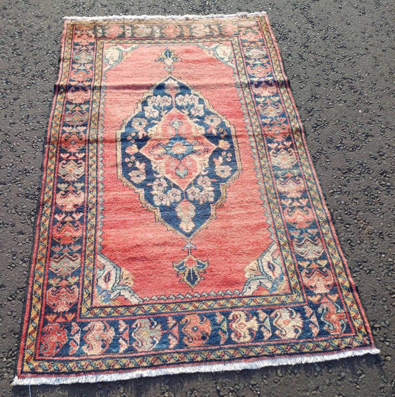 Washed red ground and woven persian village rug with central medallion design 205cm x 125cm