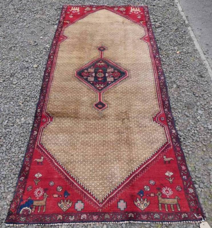 Bespoke persian village rug with open field and central medallion depicting animals 250 x 113cm