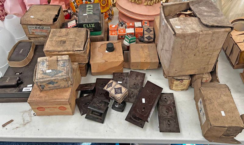 Selection of vintage electrical light switches, fuse boxes, etc