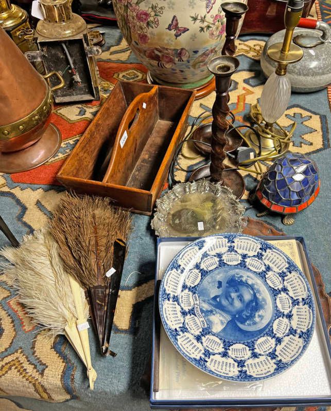 Two hand fans, barley twist candle stick holders, leaded glass turtle shaped lamp, wedgwood queen mother centenary calendar plate, etc