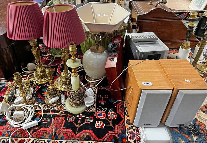 Panasonic cd stereo system with speakers, gilt metal classical table lamps, etc