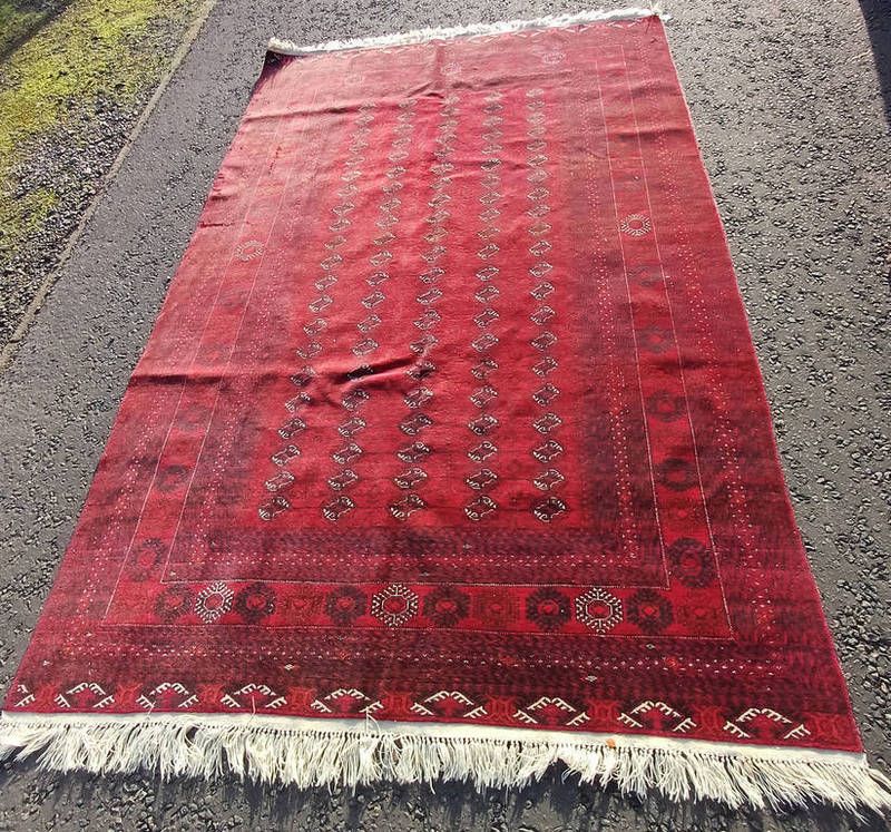 Fine hand woven rich red ground turkman carpet with all over bakara design 294cm x 191cm
