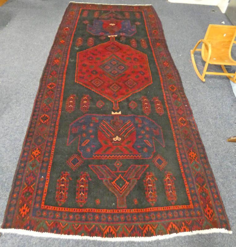 Bespoke persian village rug with open field and central medallion depicting animals 250 x 113cm