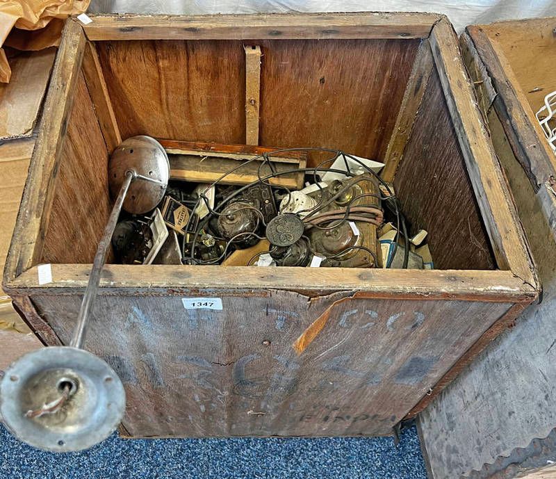 Tea chest containing a large selection of various vintage electrical components