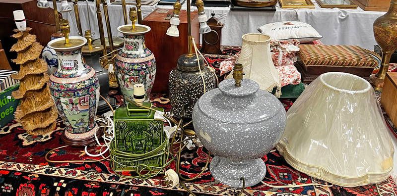 Selection of table lamps to include a pair of chinese vase lamps, holkham england green aztec lamp, oriental blue and white example etc