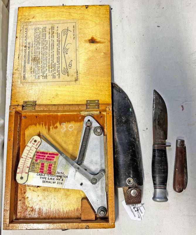 William rodgers i cut my way ww2 period knife in leather sheath, folding pocket knife and a boxed cable tension meter type sme mkv -3-