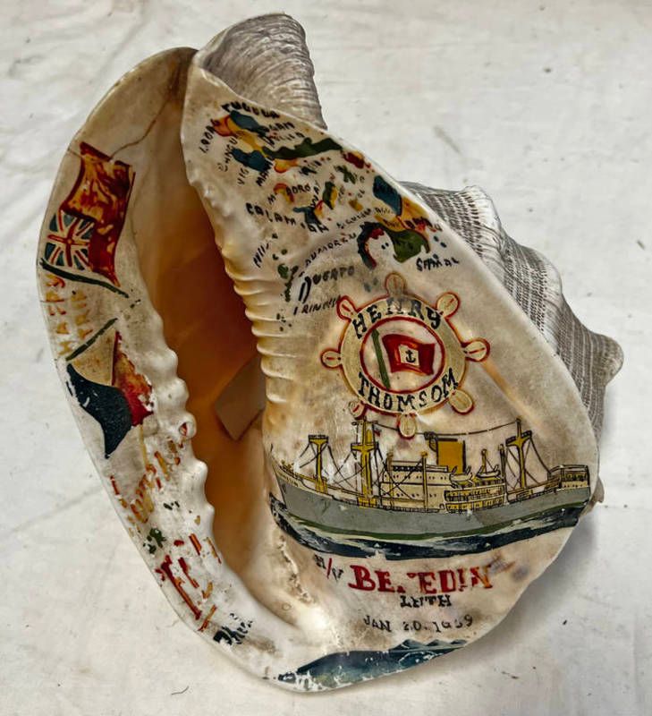 Conch shell with painted ship scene to body 'henry thomson, benedin leith', 23cm tall