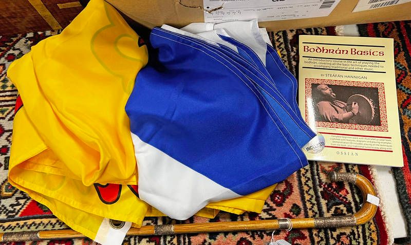Middle eastern style walking stick, 2 saltire flags, scotland flag, etc