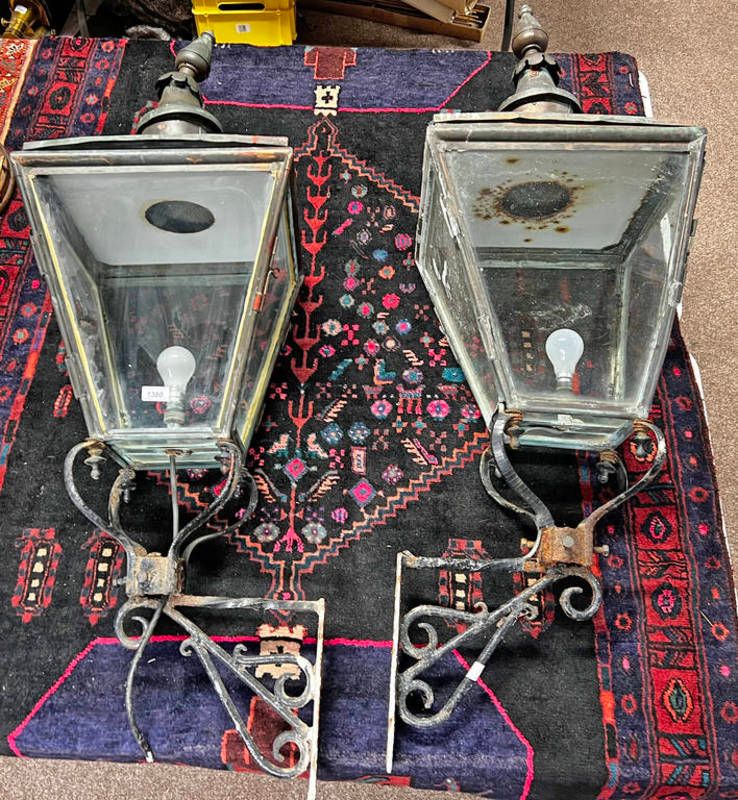 Pair of copper and iron victorian style street lights, both with glazed panels and wired for electricity