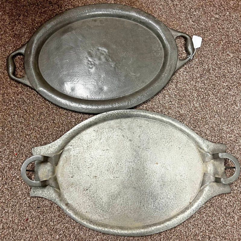 Large pewter arts and crafts tray by connell 83 cheapside and one other hammered pewter serving tray, 61cm and 62cm across -2-