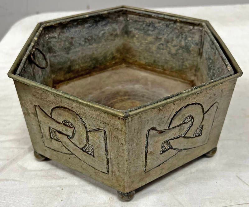 Art nouveau hexagonal planter with removable interior tray, 19.5cm across