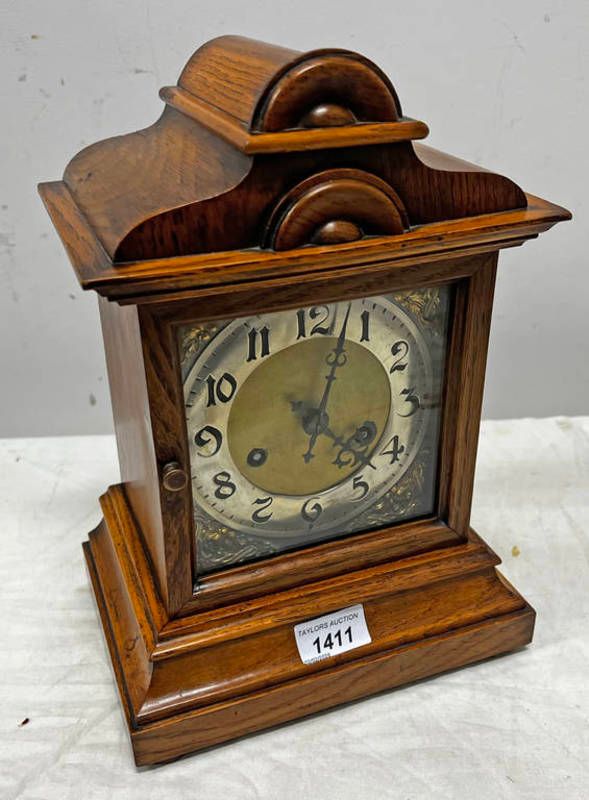 Late 19th or early 20th century oak cased mantle clock with silvered and gilt metal dial, 32cm tall