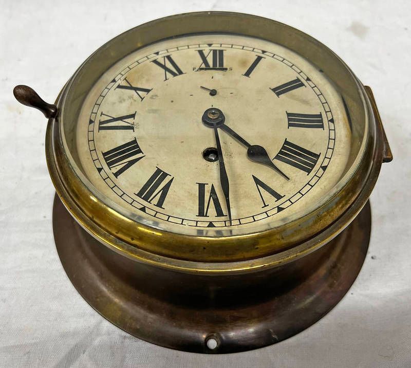 Brass bodied ships bulk head wall clock, dial marked smiths empire, with later battery operated...