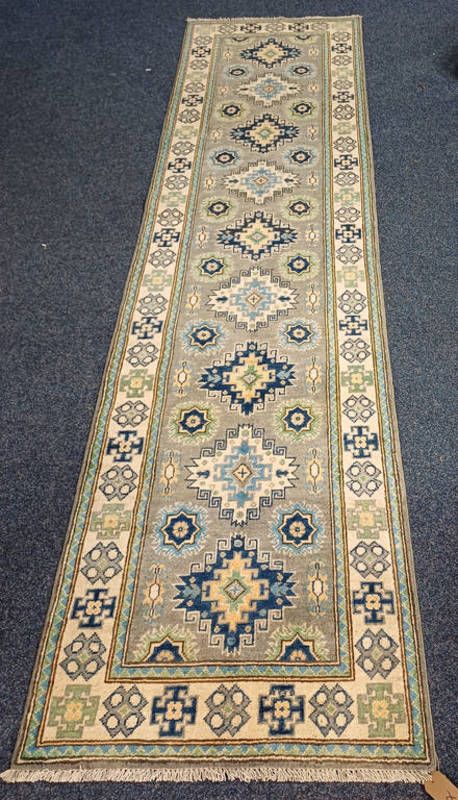 100% full wool pile coloured kazak runner with unique medallion design, 297 x 80cm