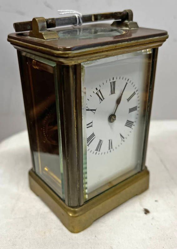 Late 19th or early 20th century gilt metal carriage clock with roman numerals to dial, 12cm tall