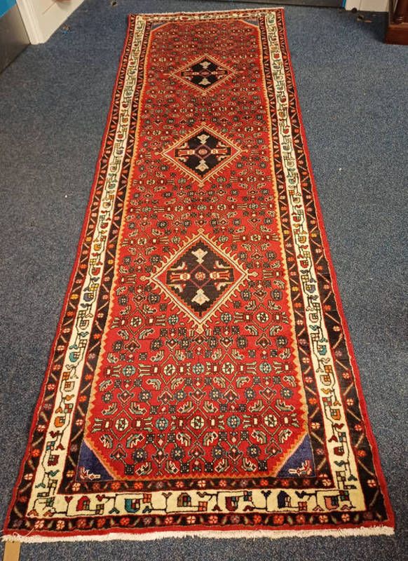 Full pile hand woven persian suru runner with diamond medallion design, 331 x 108cm