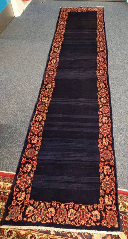 Rich blue ground hand woven persian kerman runner, plain field to middle with surrounding floral border 378 x 88cm