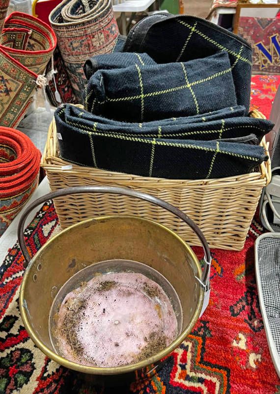 Brass jelly pan, wicker basket and two tartan covers