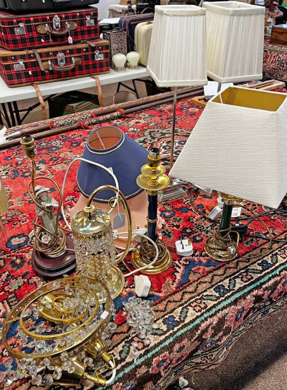 Two pairs of table lamps with shades, figural table etc