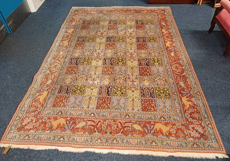 Fine hand woven full wool pile persian carpet with traditional persian panel design with surrounding border depicting animals, 293 x 199cm
