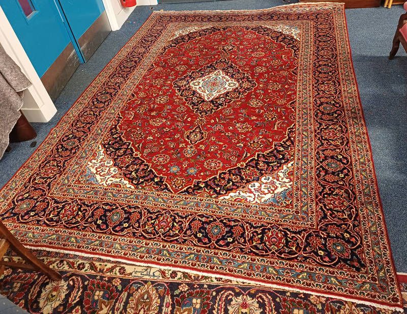 Red ground hand woven persian kashan carpet with diamond medallion design with surrounding border, 346 x 246cm