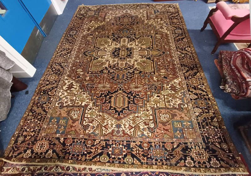 Heavy piled full wool hand woven persian heriz carpet with central medallion design and unique colours, from northern iran, 332 x 246cm