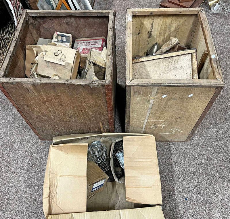 Two tea chests containing various vintage electrical fittings, fixings etc