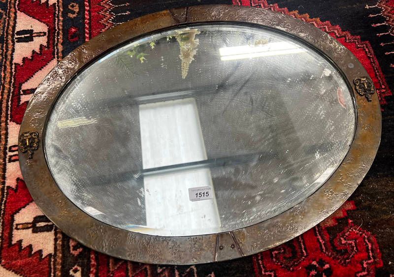 Oval wall mirror with metal frame and rams head mounts, 66 cm across