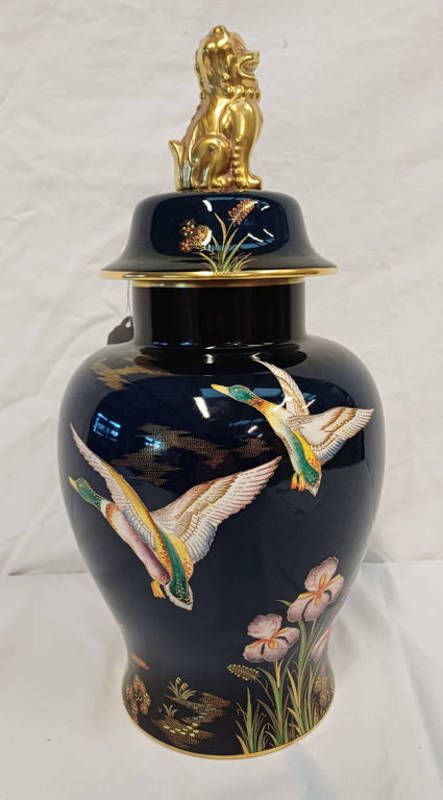 Carlton ware lidded vase decorated with mallard ducks, the lid with dog of fu to top - 42cm tall