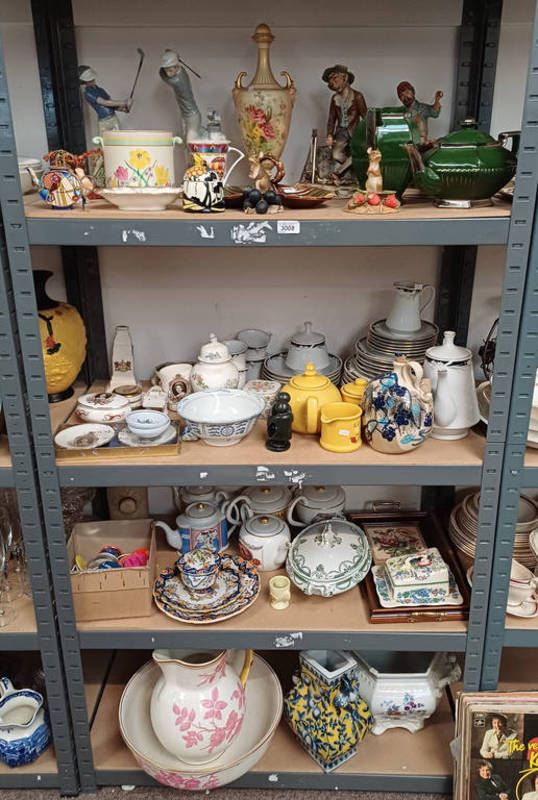 Selection of various porcelain including masons butter dish, royal worcester vase, border fine arts animal figures and others over four shelves