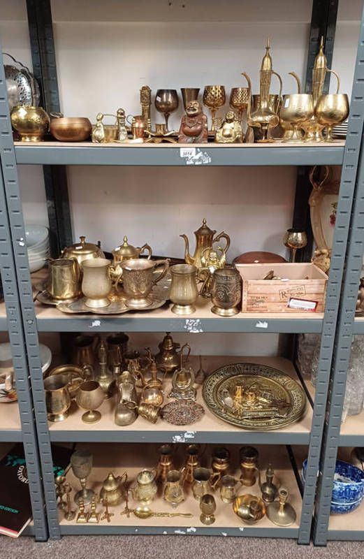 Selection of various brassware including trays, coffee pot, buddha figures and others over four shelves