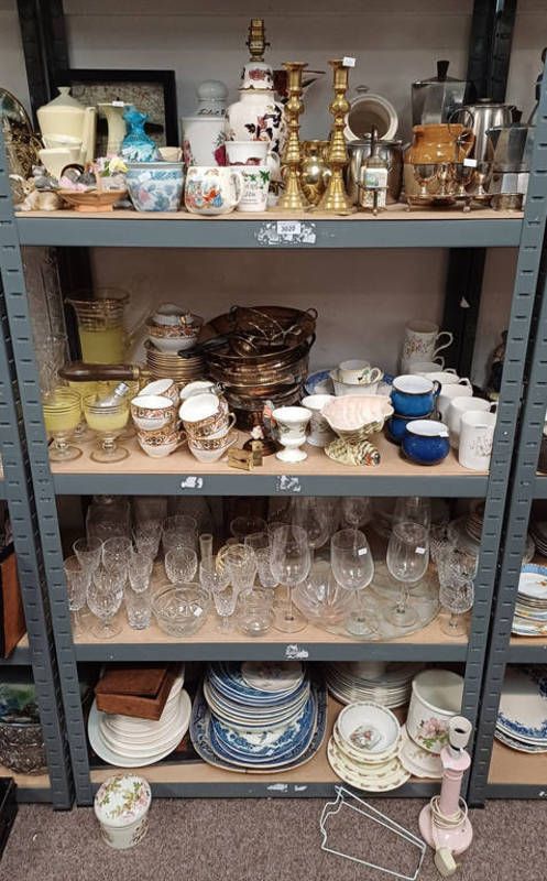 Selection of various items including masons porcelain table lamp, cauldon coffee set, pair of brass candle sticks and others over four shelves