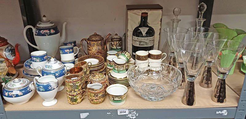 Selection of various items including wedgwood coffee set with blue siam pattern, crystal decanters, empty macallan 1861 replica bottle, and others over one shelf