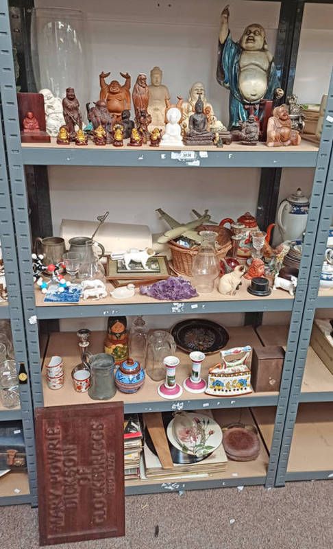 Selection of various buddha figures, vinyl records, russian dolls and others over four shelves