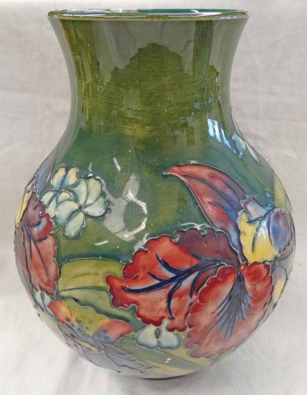 Moorcroft green ground vase with orchid pattern, impressed and signed with paper label to base, 24cm tall
