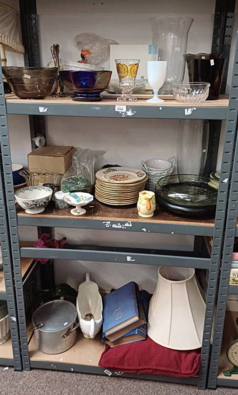 Selection of various items including glass vases, royal winton pedestal dish, porcelain dinnerware with floral decoration and others over three shelves