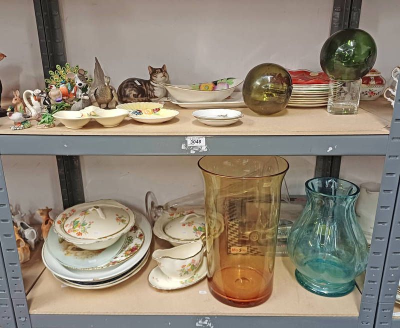 Selection of various items including border fine arts animal figures, maisto 1:18 scale mercedes clk-gtr, coloured glass vases and others over two shelves