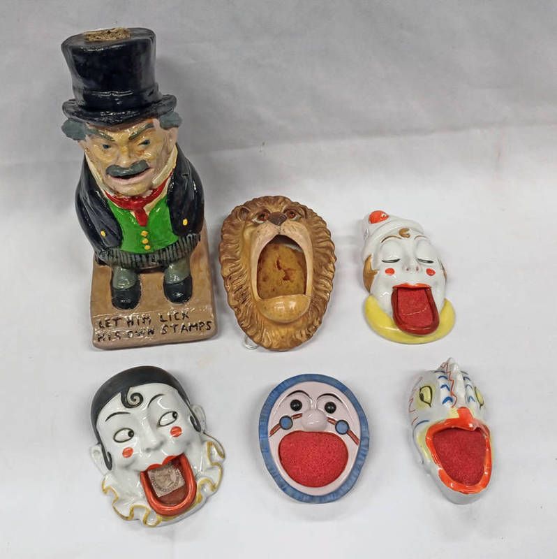 6 20th century porcelain stamp dampers including clown, lion etc.