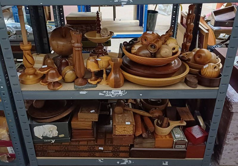 Selection of wooden items including candle sticks, trinket boxes, decorative fruit and others, over two shelves