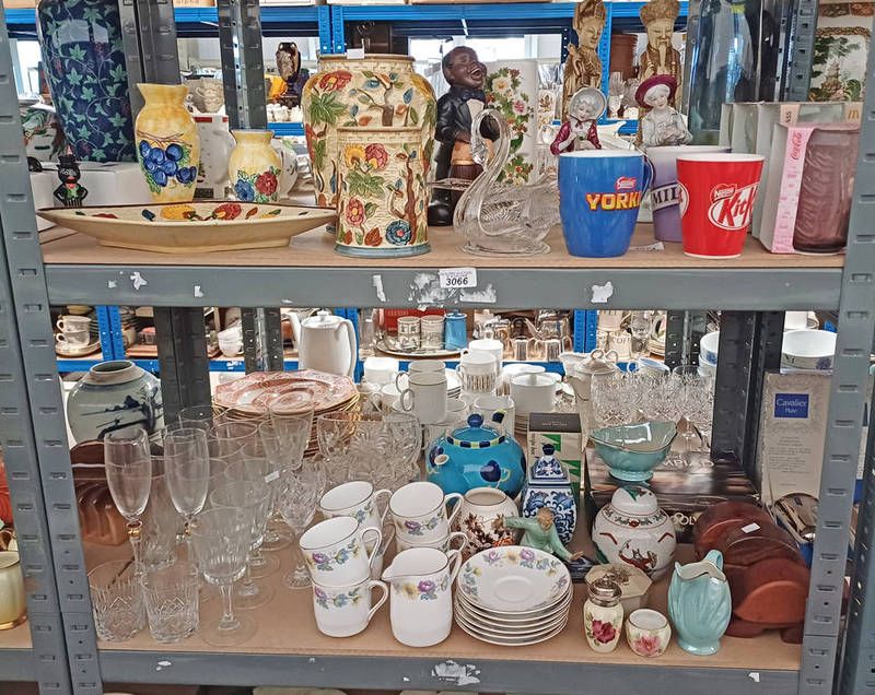 Selection of various items including maling cream jug, royal stafford tea set with day dreams pattern, mason's ginger jar and others over two shelves