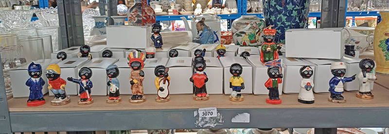 Selection of golly themed items including carlton ware figures, robertson's jam badges, tea towels and...